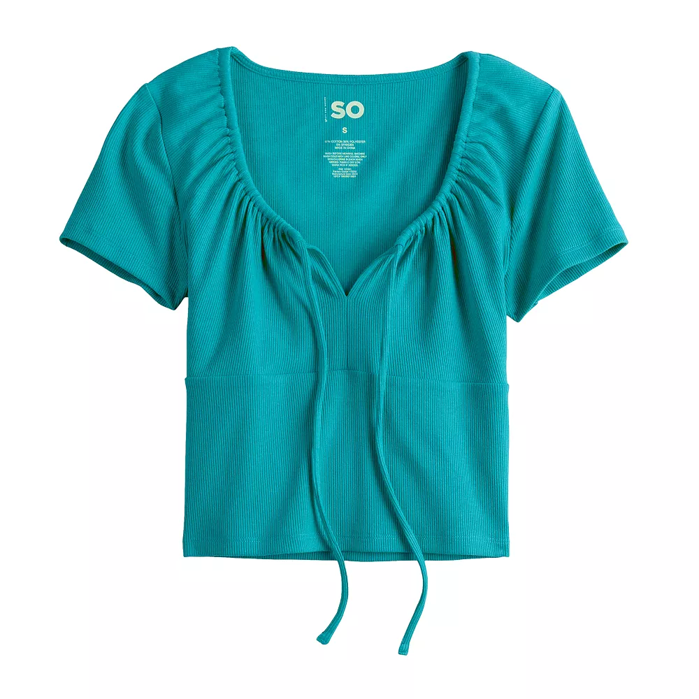 Kick up your casual game a notch with this cute juniors’ SO cropped front-tie top.