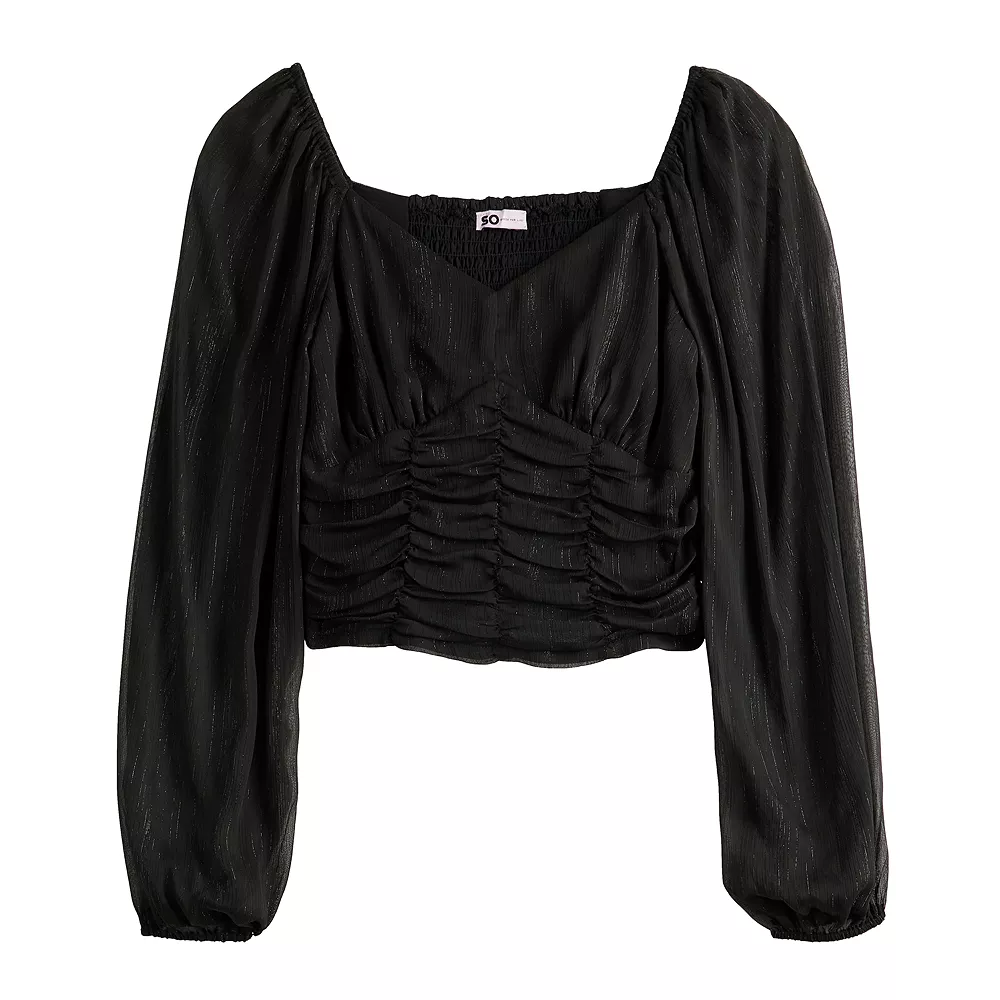 Refresh your wardrobe in eye-catching style with this ruched front juniors’ top from SO.