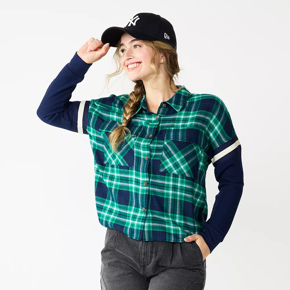 This flannel juniors’ SO top goes from soft knit sleeves to a cute flannel print, making this top as unique as it is stylish.