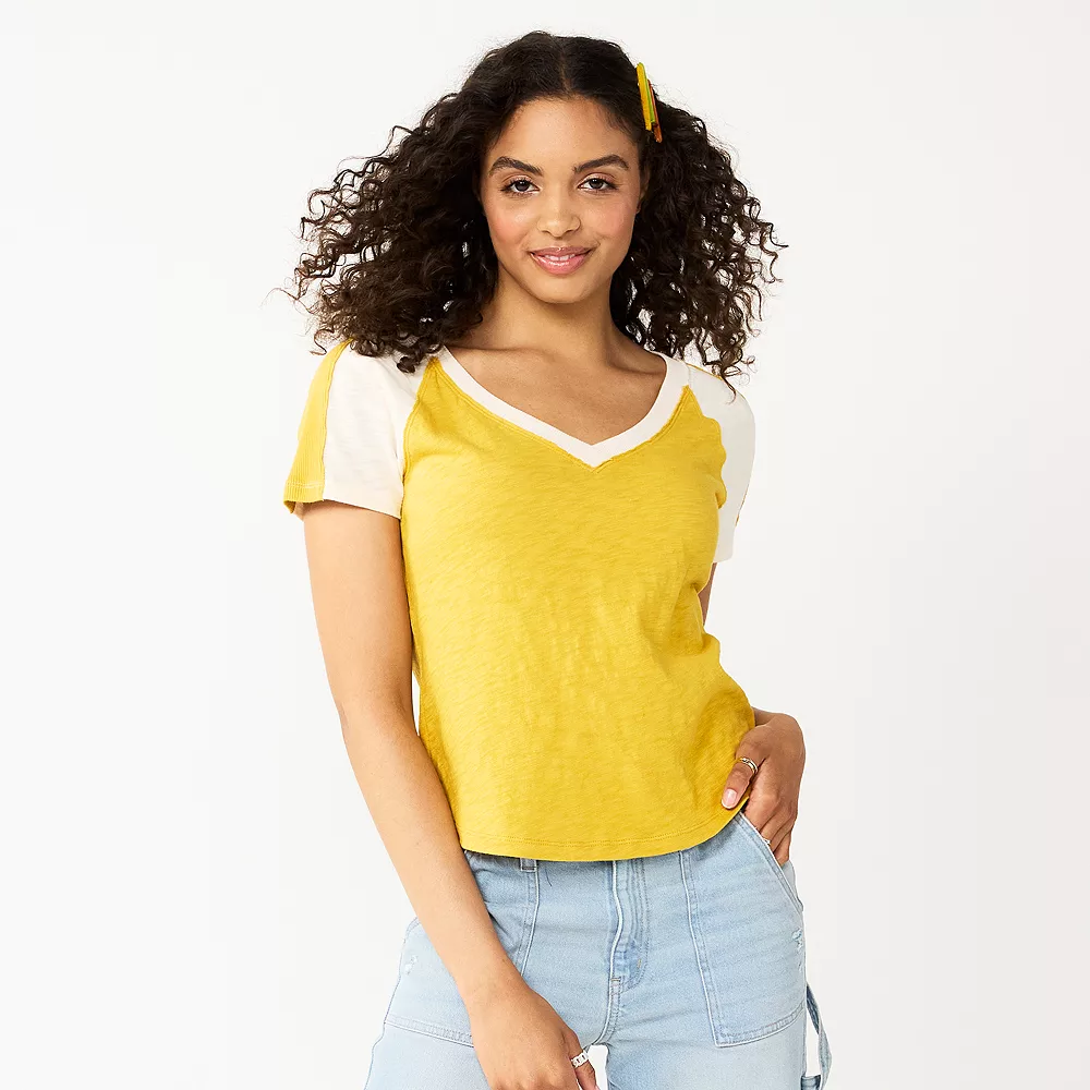 You simply can’t beat the classic look and comfy feel of this juniors’ raglan sleeve varsity tee from SO.